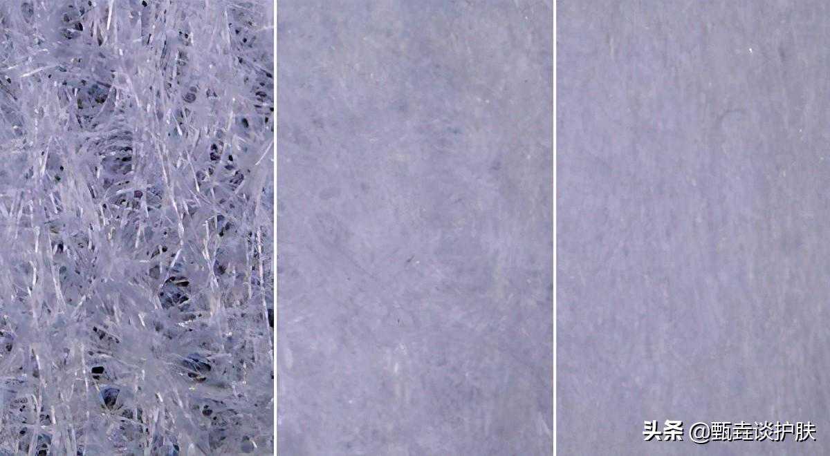 化妆棉的材质和种类很多,无论是哪种化妆棉,都是由一条条细小的纤维构成的。把不同的化妆棉放在放大镜下,如下图: