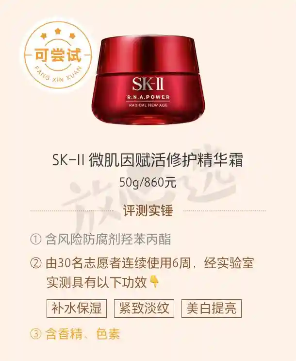 SK-II家明星产品功效方面自然拿得出手,尤为擅长紧致肌肤和保湿。只可惜成分中含风险防腐剂,故降级为可尝试。虽然是面霜,但胜在使用感清爽好吸收,油皮完全没在怕的。
