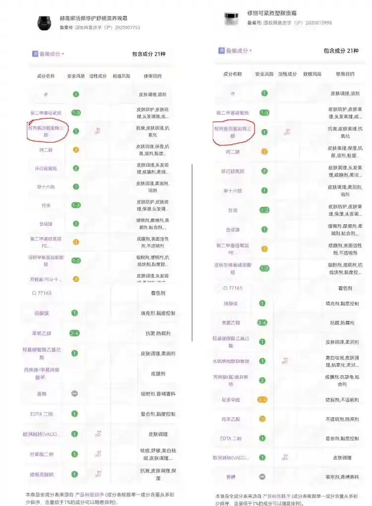 成分显示同家公司两款面霜除了个别肤感调节剂外,成分是一样的: