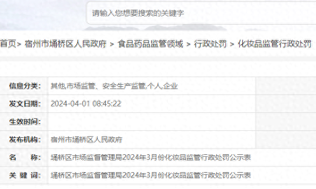 宿州市埇桥区人民政府1日发布行政处罚信息,信息显示,因销售无中文标识的化妆品,宿州市埇桥区轻柔化妆品店被罚款1000元,信息如下: