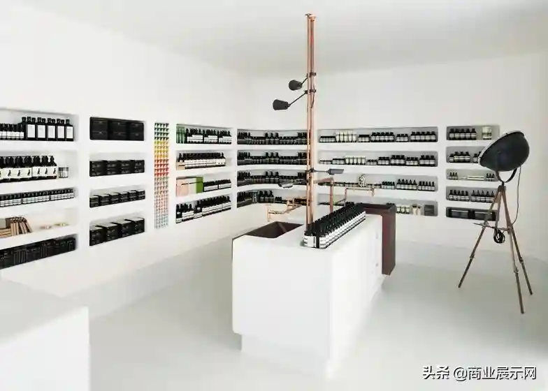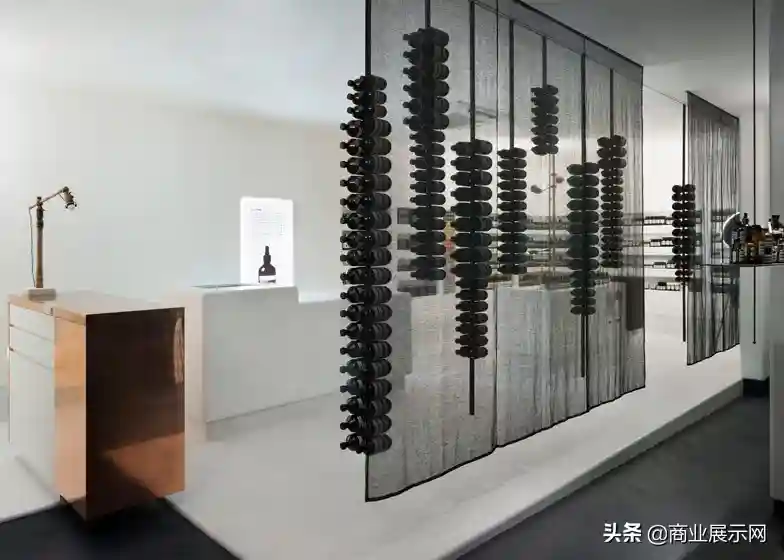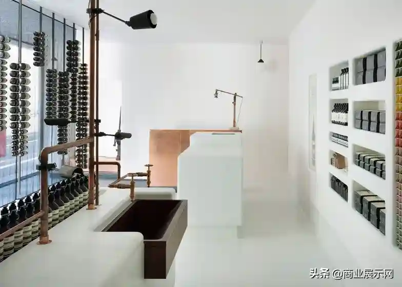 设计团队用悬挂有Aesop包装瓶的黑色幔帐区隔白色空间,同时也以包装瓶和铜质管道把店铺划分为若干块展示区域,产品则根据日文顺序进行排列,整个展示空间由中央装有铜质管道的工作台及水槽构成。