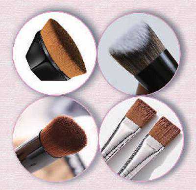 ▶粉底刷:常见的粉底刷有平口形、楔形、扁平形等,各有优劣。一般来讲,毛越密实、越柔软,越不容易留刷痕;刷口面积越大,上妆速度越快;刷面越扁,妆效越薄透水亮,但同时粉底的遮瑕效果也会打折扣;刷面如果有弧度或坡面,能更好照顾到鼻翼、眼角、眼尾等细节。