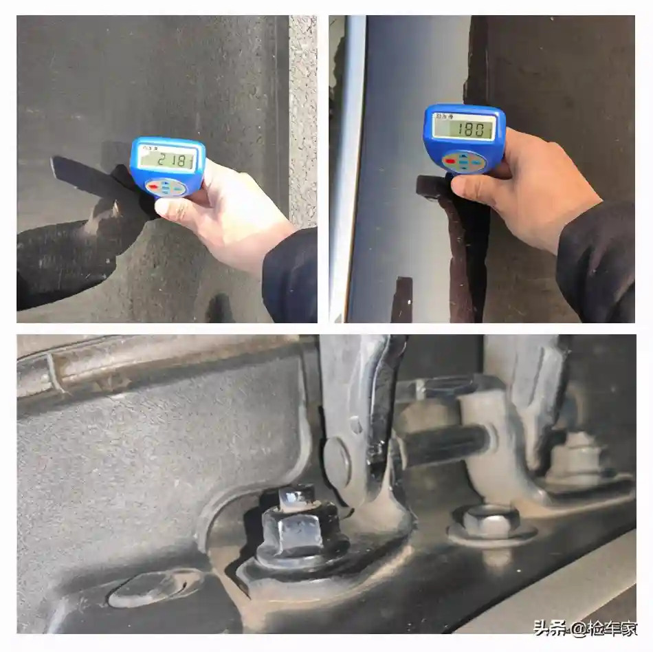 查验到右后门,发现右后门漆面厚度虽然不高,但是表面存在明显的喷漆痕迹,难道右后门也有过更换?然后打开车门查验门铰链螺丝也都有拆卸,综合分析右后门有过更换,好在右后门内侧正常,说明是单向损伤。