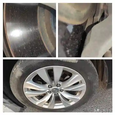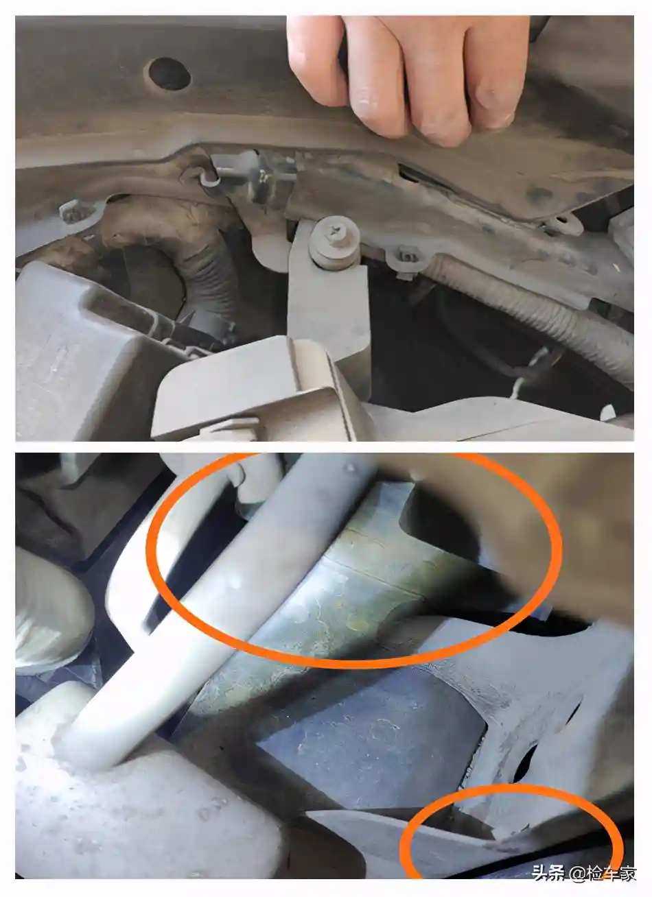 前部水箱有泄露防冻液的现象,后期也需要及时处理,要不高速行驶发现水温高了,水箱破了那就走远了。