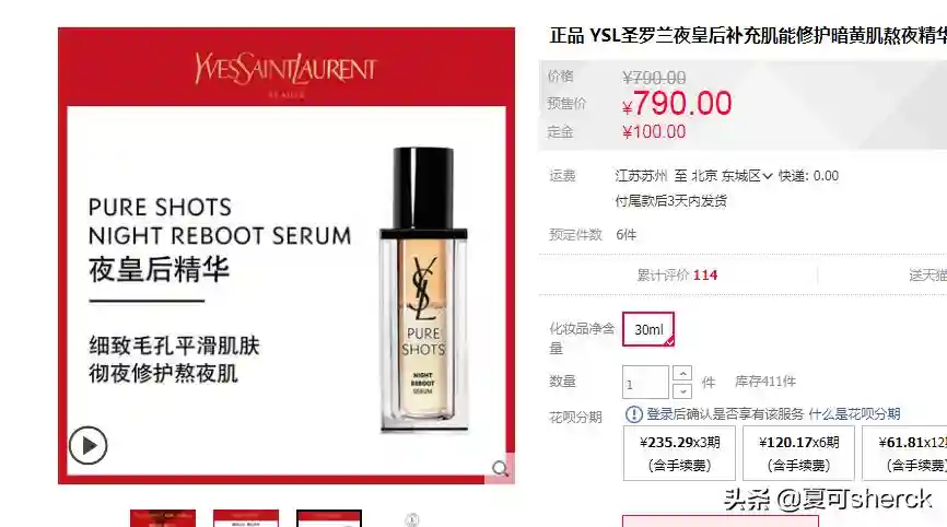 大名:圣罗兰悦享青春夜间焕肤精华液,小名夜皇后精华,30ml790元。