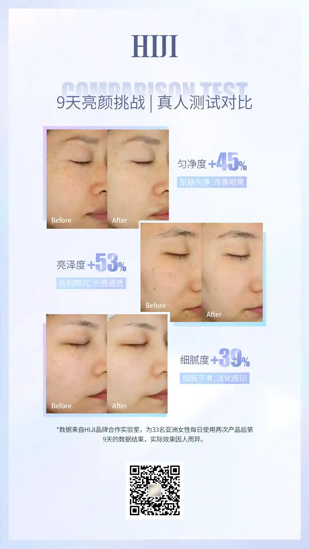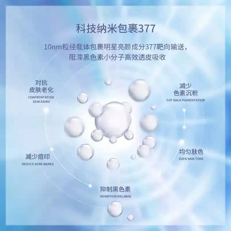 HIJI联合华中科技大学及纳米医药研究团队,研发出先端纳米载体包裹的377,这种纳米化的377,有效解决了游离377稳定性弱易变色、水溶性差、轻微细胞毒性等问题。10纳米粒径级别的小分子,更好透皮吸收,皮肤滞留性好,能深层靶向输送作用于黑色素,效果持久,美白能力UP!!