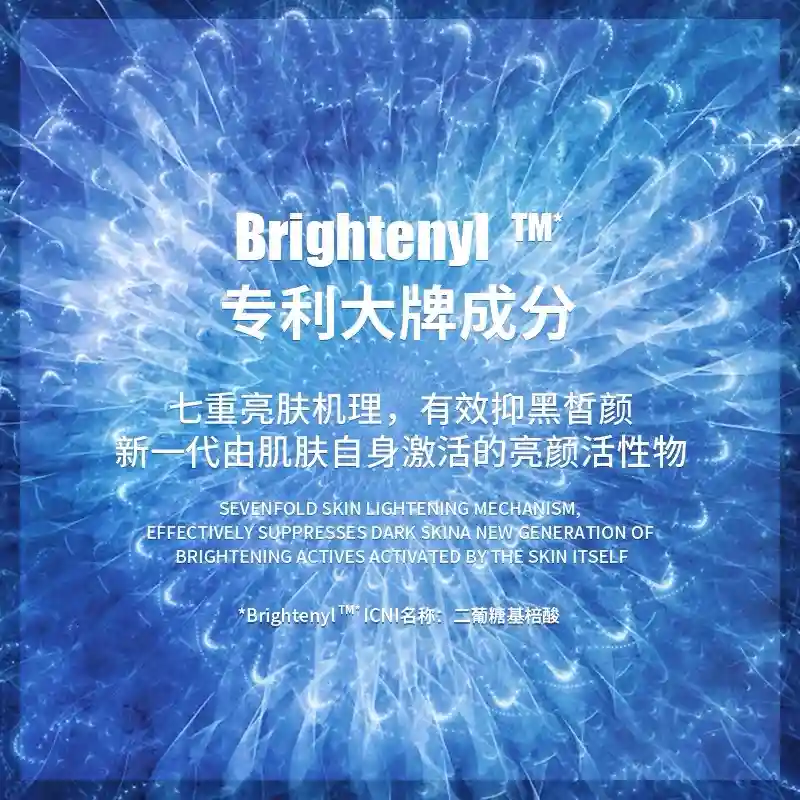 新一代由肌肤自身激活的美白亮颜成分,全称是二葡糖基棓酸。是一种通过肌肤微生群作用转化的活性功效成分,具有极佳的抗氧化效果(5倍于VC),BrightenyLTM可实现对肌肤高达99%的光保护作用,能有效减少紫外线的刺激,预防肌肤光损伤,从源头上减少黑色素的产生,同时还具有多重美白机理,除了直接抑制络氨酸酶,也可以抑制各种中间体(a-msh、MITF等等),然后再间接影响络氨酸酶。阻滞黑色素生成转移,同时还能抑制细胞炎症和血管扩张,减少泛红,是一种强力的美白功效成分。
