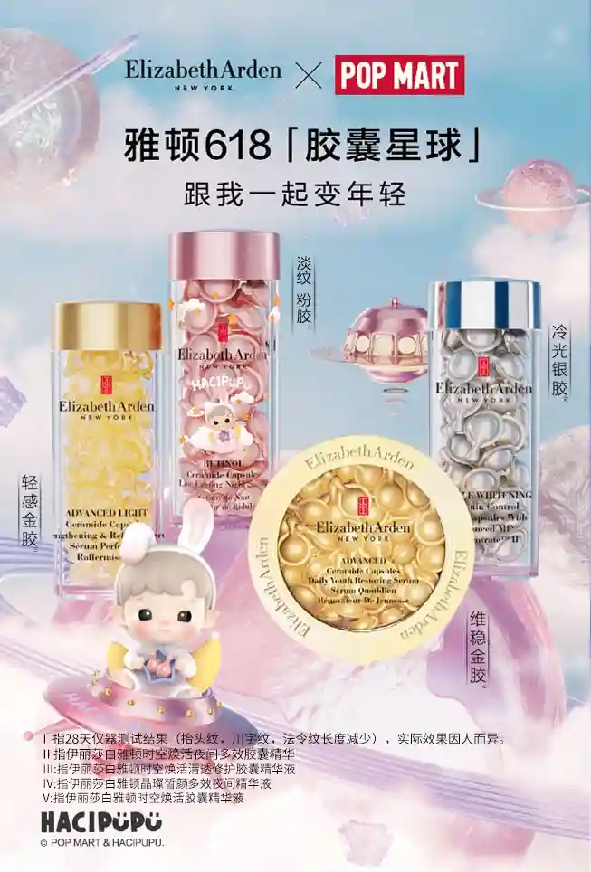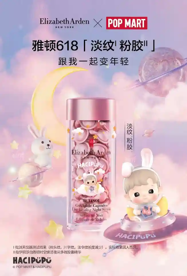 雅顿粉胶与泡泡玛特联名定制HACIPUPU——「粉小兔」梦幻潮玩手办,「粉小兔」拥有一对粉嫩兔耳,萌趣纯真充满治愈力,端坐月亮之上,手捧惊喜礼盒送上年轻好礼——雅顿粉胶,邀约一起登陆粉嫩星球,开启星际探险,奇遇年轻宝藏。次抛A醇粉胶,采用明星胶囊密封技术,避光避空气,实力锁鲜高能抗老,颗颗精准高效;「双胜肽」组合卓效促进胶原合成,令肌肤饱满充盈,紧致嘭弹;萃取黄金抗老成分0.1%浓度真A醇,高能淡纹抗初老,细腻毛孔平滑肌肤;复配神经酰胺,强韧肌底,稳塑屏障,有效减少A醇刺激,建立肌肤耐受,温和有效,快速逆转熬夜倦容,28天闪现紧致嘭弹肌,肌肤粉嫩没“纹”题。