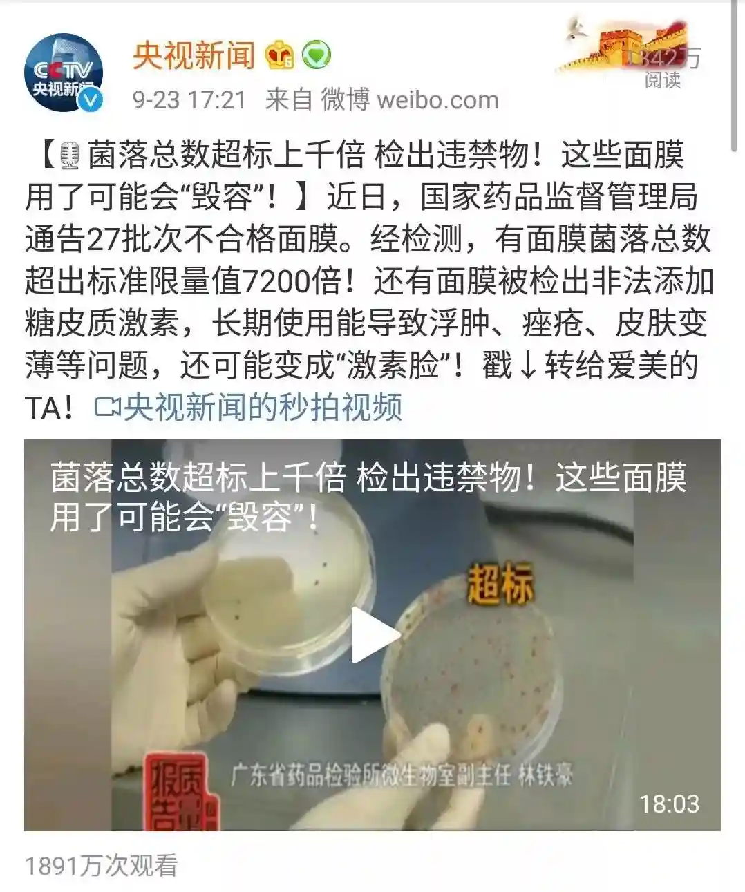 经药监局检测发现:其中有样品面膜菌落总数超出标准限量值7200倍!还有面膜被检出非法添加糖皮质激素!