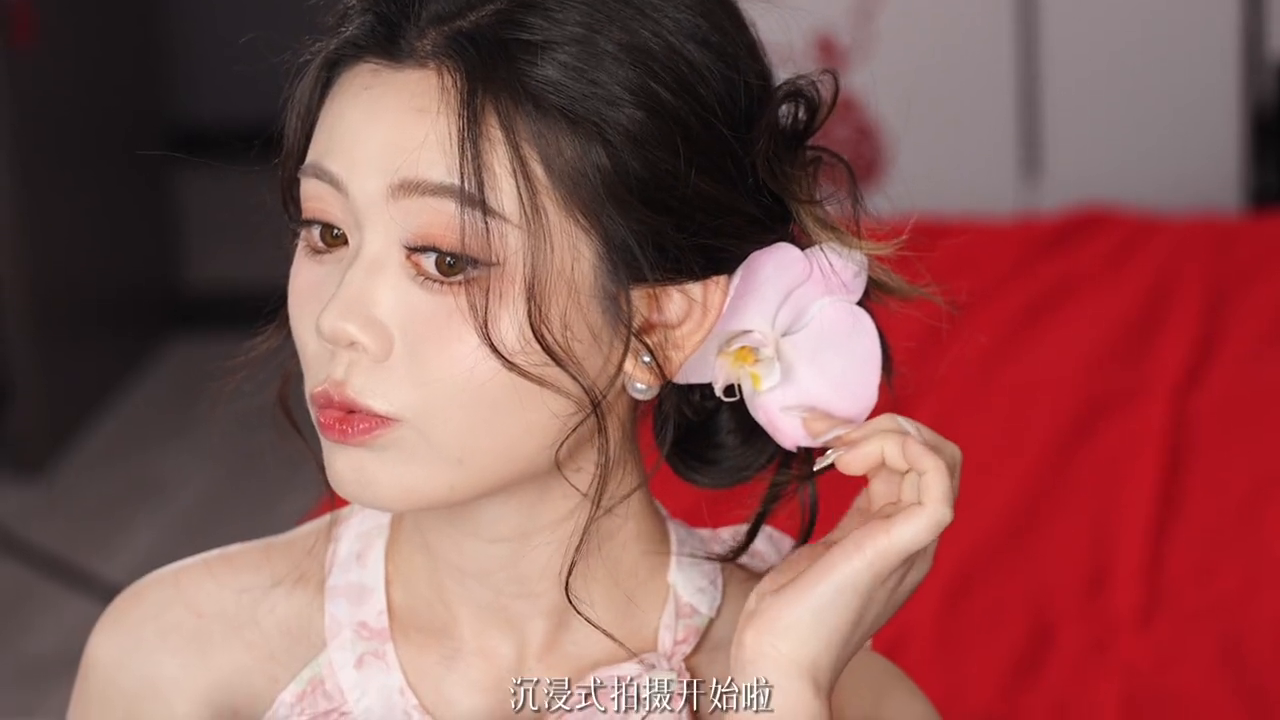 ·做好妆前准备工作,眼部遮瑕后从眼妆进行刻画。暖粉色的眼影平铺,刻画饱满的卧蚕,夹翘睫毛,粘上灵动的睫毛,修饰眼睛轮廓。染眉膏统一眉毛颜色,打造棕色自然的丝雾眉。平铺基础底妆,面妆提亮,修正下妆面细节,点下腮红,增加妆面氛围感。画个饱满的唇型,自然灵动的侧丸子头,搭配蝴蝶兰鲜花头饰,是春天的感觉。沉浸式拍摄开始啦。