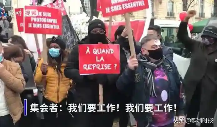 ▲去年12月14日,法国餐饮酒店业者在巴黎荣军院广场举行集会示威,高喊:“我们要工作!”(记者梁家铭拍摄)
