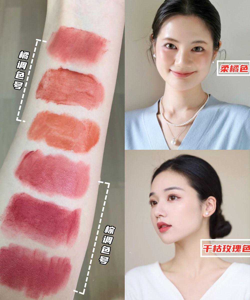 肤色暗沉的黄黑皮在选择口红时,记得避开冷调颜色,深色的效果更加!比如:棕调的红色、橘棕、红棕、枫叶。但是总结来,下面这两个大色调的色号,基本不挑人,涂上非常温柔显气色。▼▼