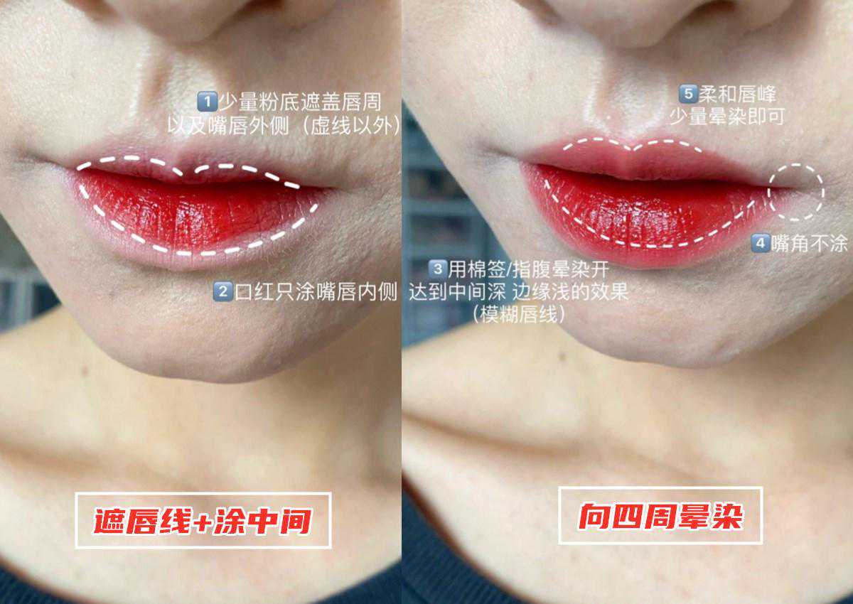 正确的画唇步骤简单来说可以总结为4点:️少量粉底遮盖嘴唇外侧️、口红只涂嘴唇内侧再晕染️、唇峰少量晕染️、嘴角忽略不涂。