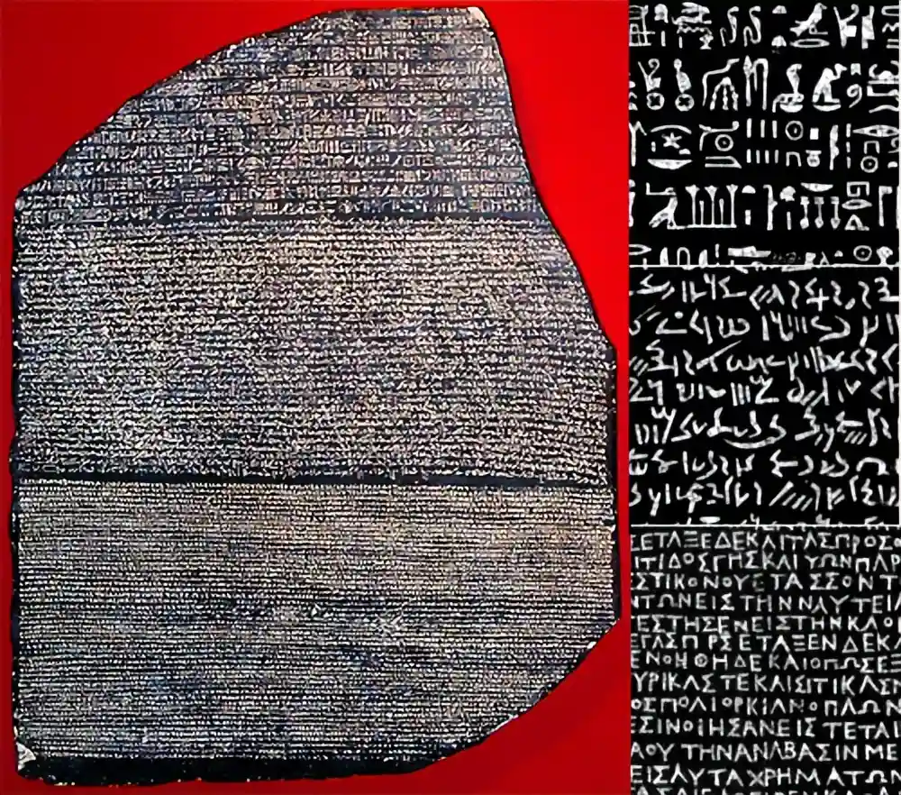 罗塞塔石碑上的诏书由三种对照文字表述,分别为古埃及象形文字圣书体Hieroglyphs(用于祭司法令)、埃及草书世俗体Demotic(用于日常,意为“人民的语言”),和古希腊文(行政语言,为当时统治埃及的希腊人使用)。自这块石碑被发掘出来,无数学者为之着迷,倾情投入到碑文的破译工作中。