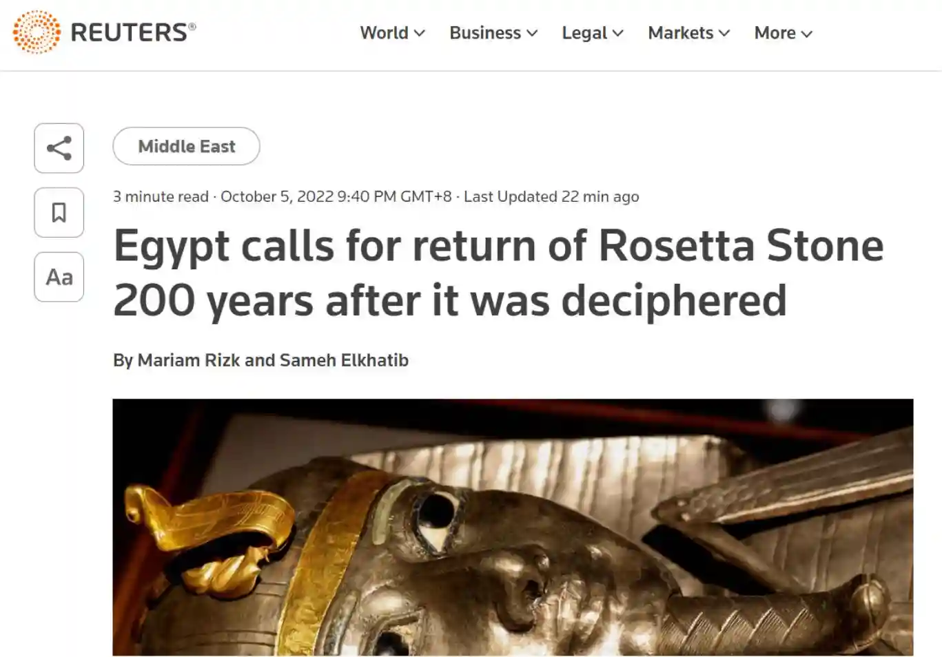 欧美主要媒体最近都有专题新闻报道,介绍埃及活动家们正在向埃及政府请愿,以便正式要求英国归还罗塞塔石碑及其它16件标志性埃及文物。专家们呼吁:这些珍贵艺术品是几个世纪以来英国从埃及非法夺走的,如今该物归原主了。
