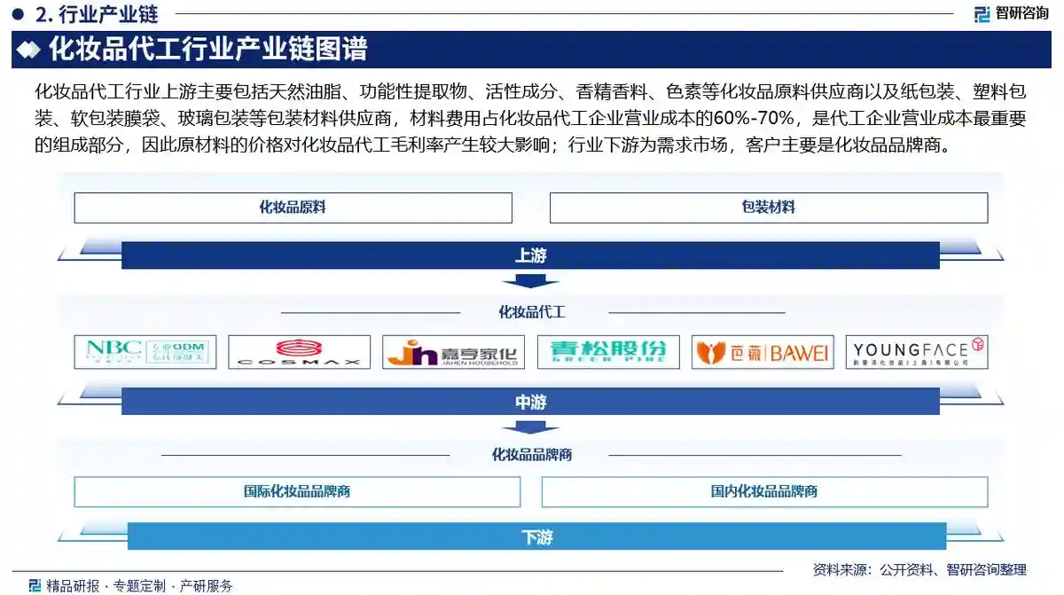 化妆品代工行业上游主要包括天然油脂、功能性提取物、活性成分、香精香料、色素等化妆品原料供应商以及纸包装、塑料包装、软包装膜袋、玻璃包装等包装材料供应商,材料费用占化妆品代工企业营业成本的60%-70%,是代工企业营业成本最重要的组成部分,因此原材料的价格对化妆品代工毛利率产生较大影响;行业下游为需求市场,客户主要是化妆品品牌商。