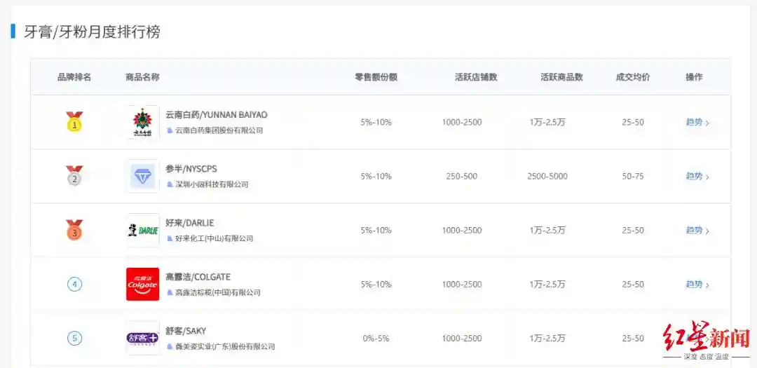 据新华网援引中国口腔清洁护理用品工业协会发布的数据,2024年8月,牙膏/牙粉月度排名前五的品牌分别为云南白药、参半、好来、高露洁、舒客,成交均价基本在25元至50元,其中销量排名第二的参半其成交均价在50至75元。据该协会调研,100g/支的标准规格下,经济型牙膏每支价格在7元以下,市场份额为16%;中档牙膏每支价格7.1至15元,市场份额为48%;高端牙膏每支价格在15元以上,市场份额为36%,这种价格水平和档次基本等同于国际较发达国家。
