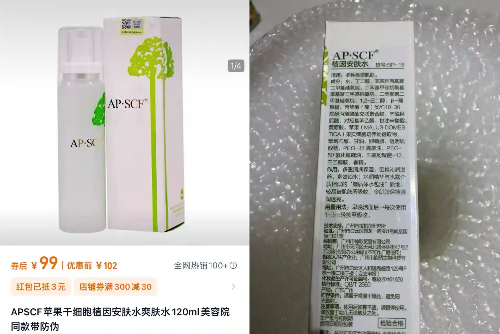 以一款优惠后售价99元的“AP·SCF苹果干细胞植因安肤水”为例,记者询问产品是否含有干细胞成分,客服人员一边表示“是的”一边发来了商品照片,“您可以看一下成分表。”通过对比可以看出,商品宣传页面所称的“苹果干细胞”即为成分表中的“苹果果实细胞培养物提取物”,据客服表示,这款商品的主要功效是“补水滋润、延缓衰老”。