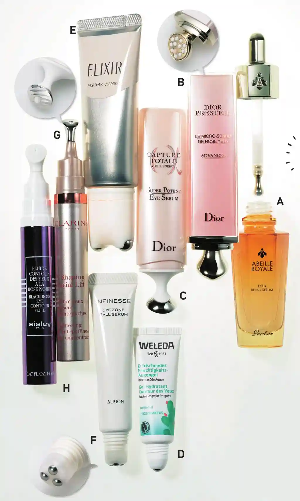 A娇兰帝皇蜂姿提升焕亮眼部精华露:源自蜜蜂的成分,瞬间提拉眼角。BDior迪奥花秘瑰萃滚珠眼部精华:高效促进容易停滞的微循环。C迪奥肌活蕴能眼部精华:柔软灵活的按摩棒适用于所有眼型。D维蕾德仙人掌眼霜:取得有机认证NATRUE标识。E怡丽丝尔滚珠塑颜精华露:根据肌肉走向按摩,促进血液循环。F澳尔滨INFINESSE眼霜:管口的三颗滚珠让眼部疲劳一扫而空。G娇韵诗立体塑颜眼精华:对付眼部浮肿,效果立竿见影的清凉按摩头。H希思黎黑玫瑰焕采精华眼霜:含有丰富类黄酮的红葡萄叶提取物让眼周恢复紧致。