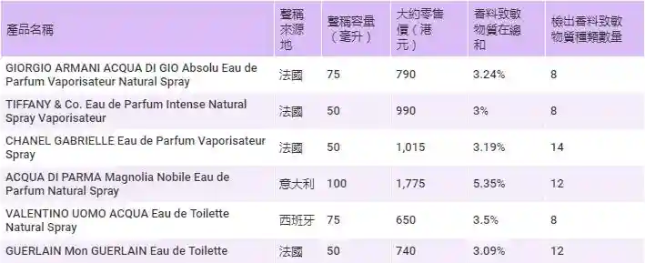验出致敏物质的浓度总量最高的(5.35%),也是一款淡香精,其售价为1775港元,是每瓶售价最昂贵的测试样本(ACQUADIPARMAMagnoliaNobileEaudeParfumNaturalSpray)。