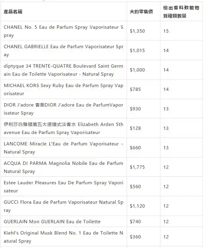 道,香港消委会测试市面上55款香水的安全程度。此次测试的55款香水,每瓶售价由48港元至1775港元不等,若以每毫升计算,则为0.5元至27元。结果发现: