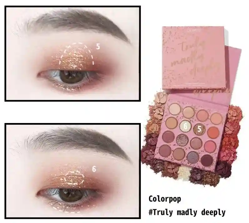 点缀些深浅不一的大颗粒闪片色,还是在眼球上方,增加眼妆的层次感,别忘了卧蚕~