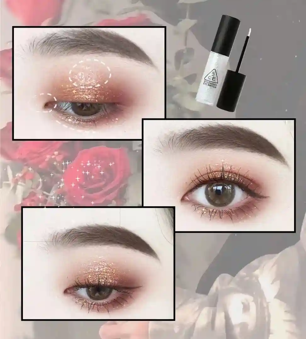 单眼皮的妹子只需要在眼球正上方和卧蚕前半段扫一点点亮片色就可以了,大面积使用亮片色很容易显肿。