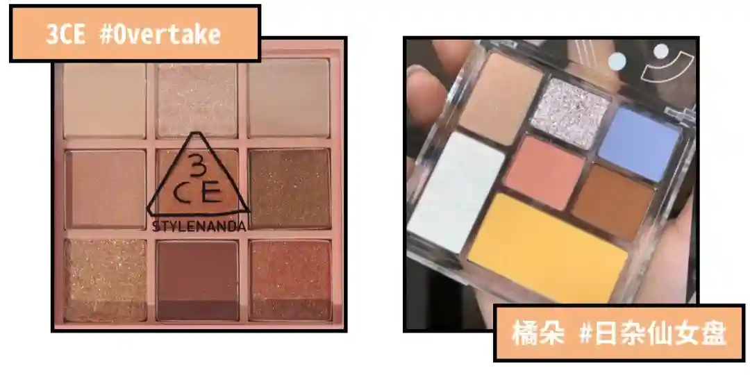 选取一个深一点的红棕色压一下后眼尾和下眼睑,再用个橘棕色闪片色,只点在眼球上方的位置,范围不要大,不然显眼肿!!!