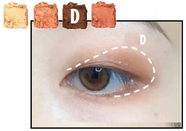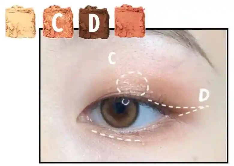 从后往前晕染最深色,注意眼尾的颜色一定是最深的,然后用余粉把下眼睑后半段扫上阴影。