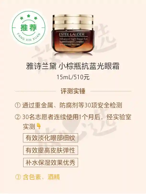 小棕瓶系列的实力在评测中得到了充分验证,安全+淡纹+提弹+保湿,综合实力吊打参与评测的所有眼霜(共20款),囤一瓶肯定不亏。(真不是广告)
