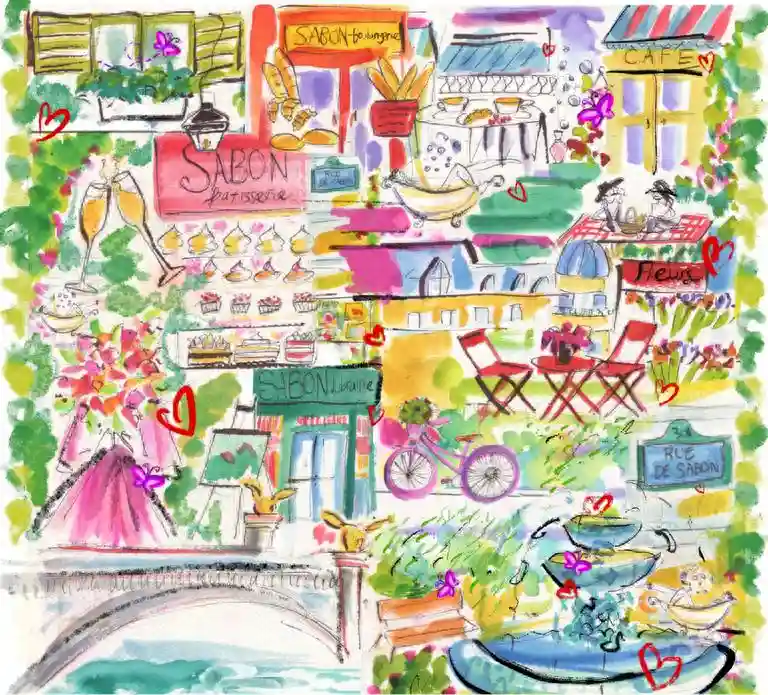 通过艺术家TaliaZoref的画作,向粉丝们展现栩栩如生的巴黎:被绿荫笼罩的名为SABON的街道、盛满鲜花的喷泉、香气四溢的SABON甜品店,又或是新鲜热闹的SABON面包房,温馨安静的SABON图书馆…一切都如此欢乐与自在,静候你的光临。