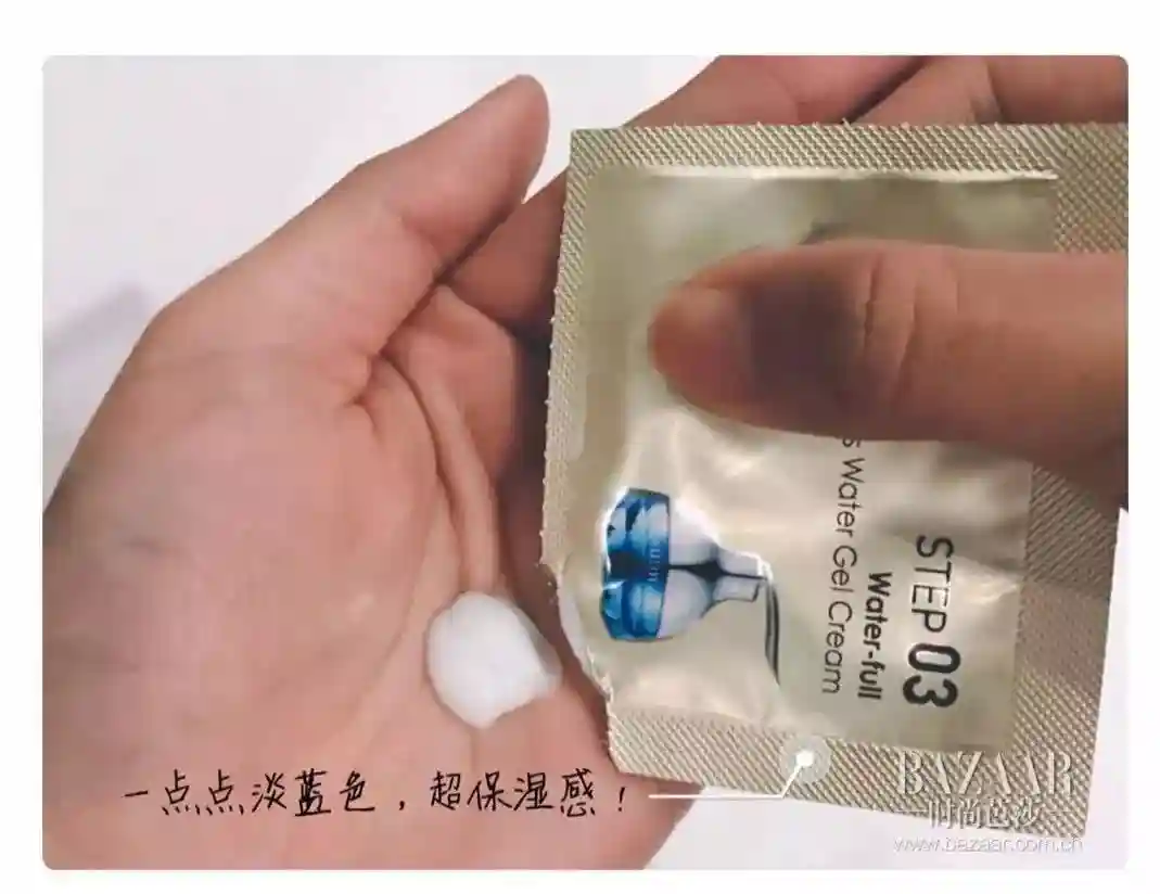 STEP3,水漾清润保湿啫喱霜。主要是补水和锁水,使得肌肤保持水润。质地是淡蓝色,略黏,但是上脸非常干爽,透气感很强。感觉覆盖了一层保水的膜。