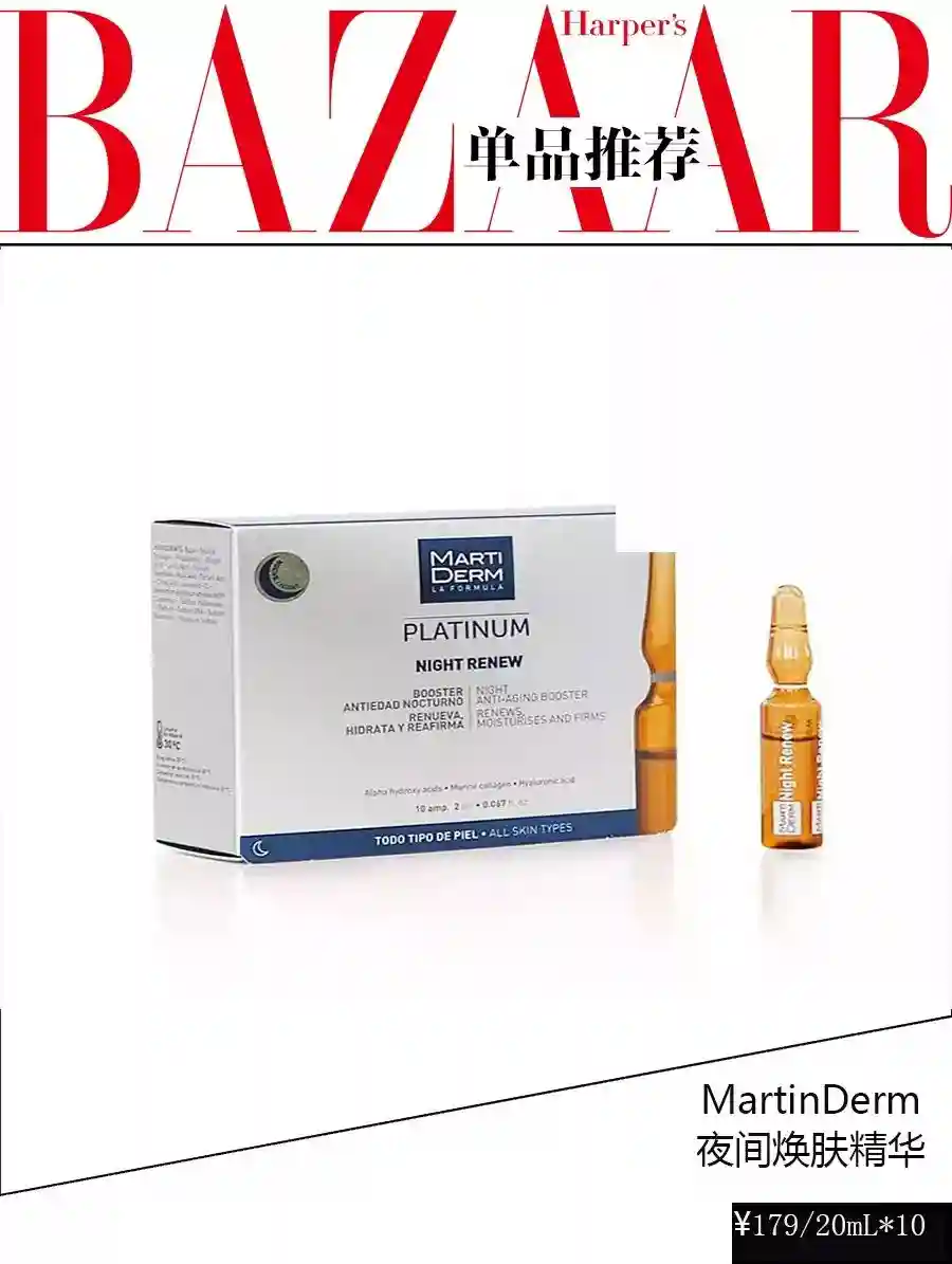Martiderm是安瓶鼻祖的说法也不为过,而这个单品是夜间焕肤精华,适合夜间使用,富含三大珍奢成分:10%复合果酸、可溶性胶原蛋白、透明质酸钠,有效扫除老废角质、柔滑细腻肤质。所有MartiDerm安瓶中均不含激素,采用随用随开的安瓶充氮包装,保证每一支安瓶使用时与刚出厂时一样新鲜。富含独特的抗氧化元素,成立65年以来,以高浓度高活性成分来保证产品的高功效。