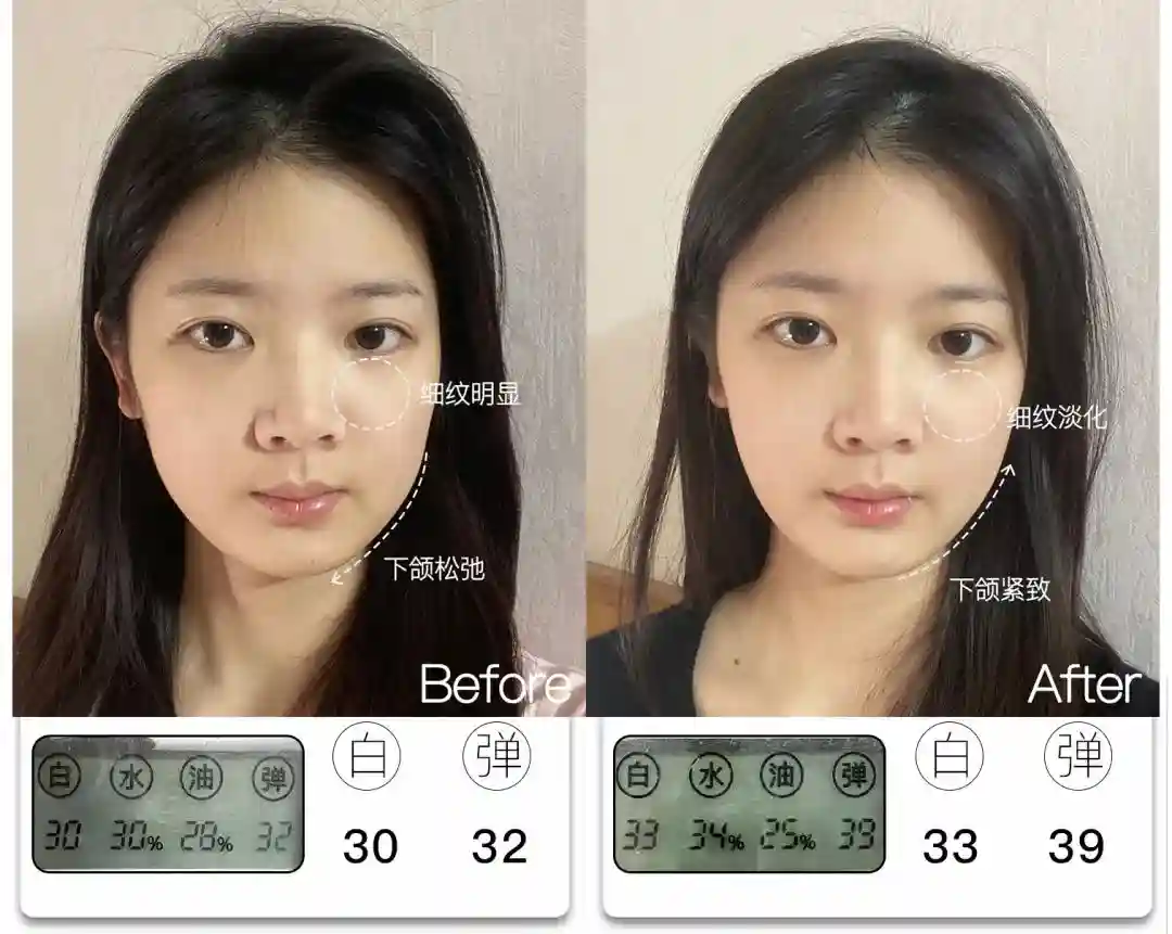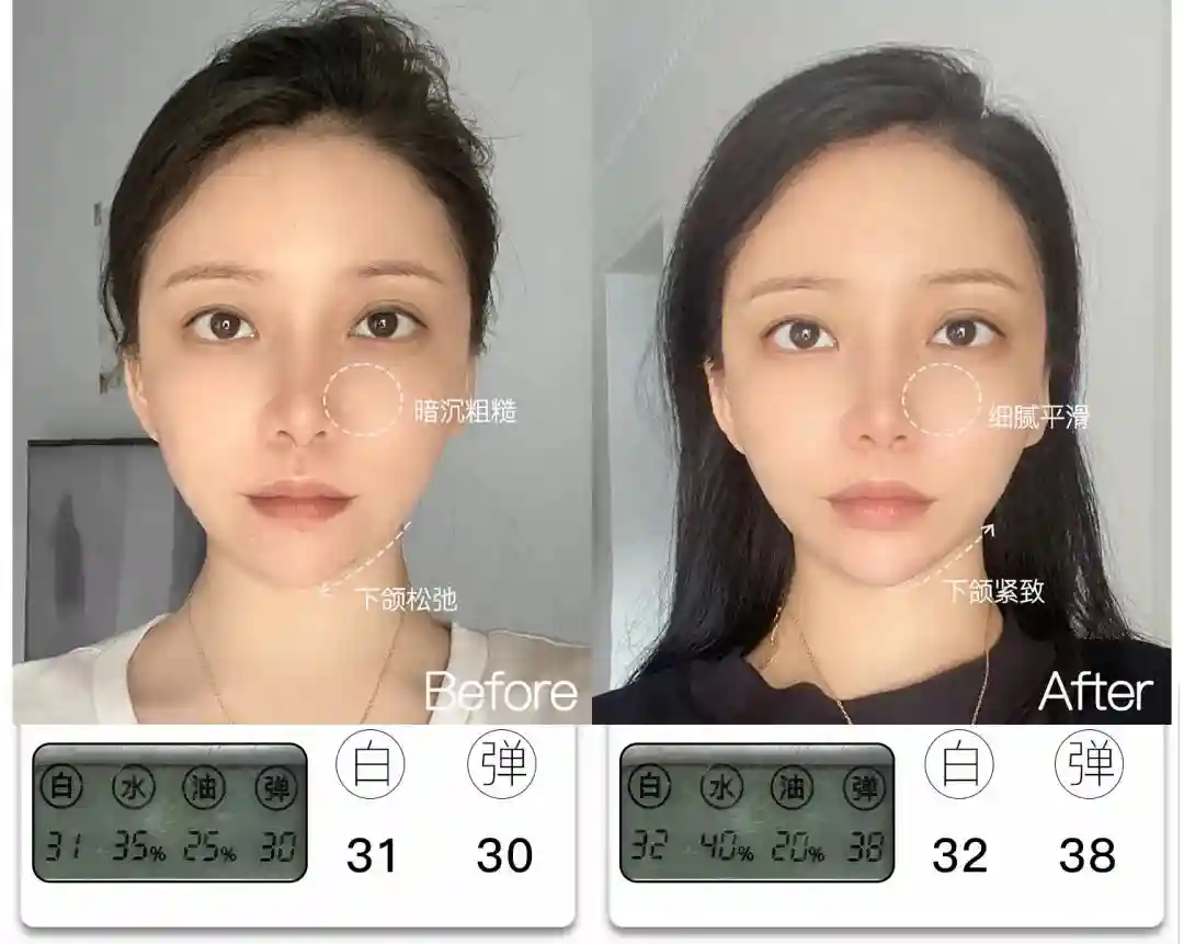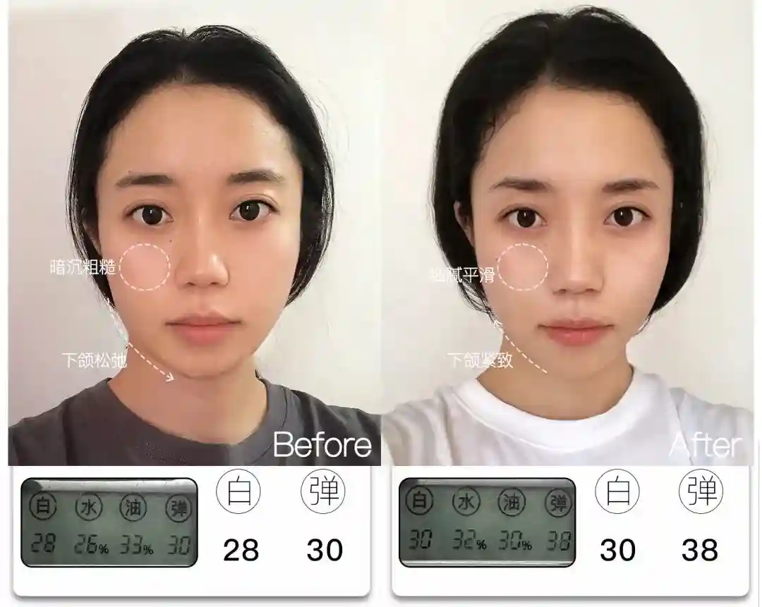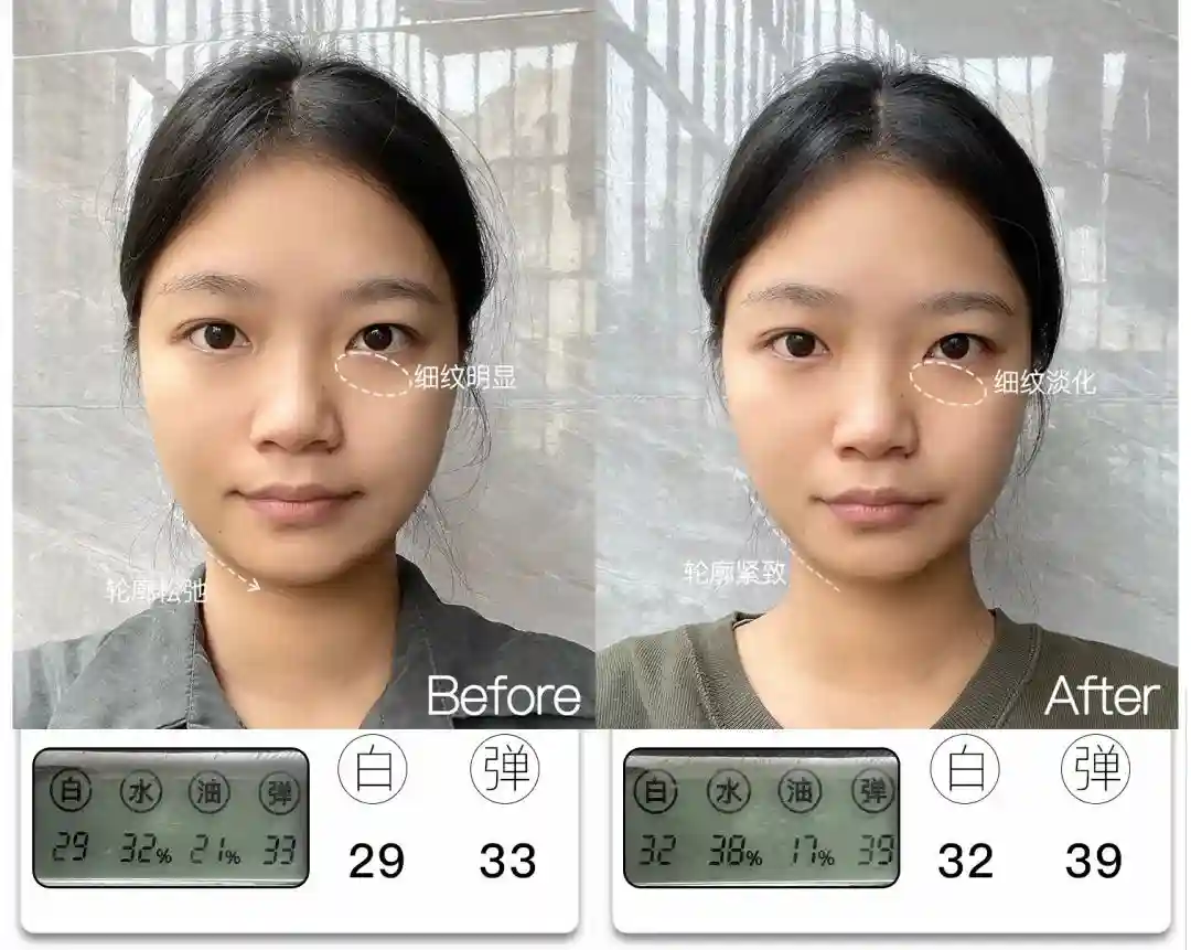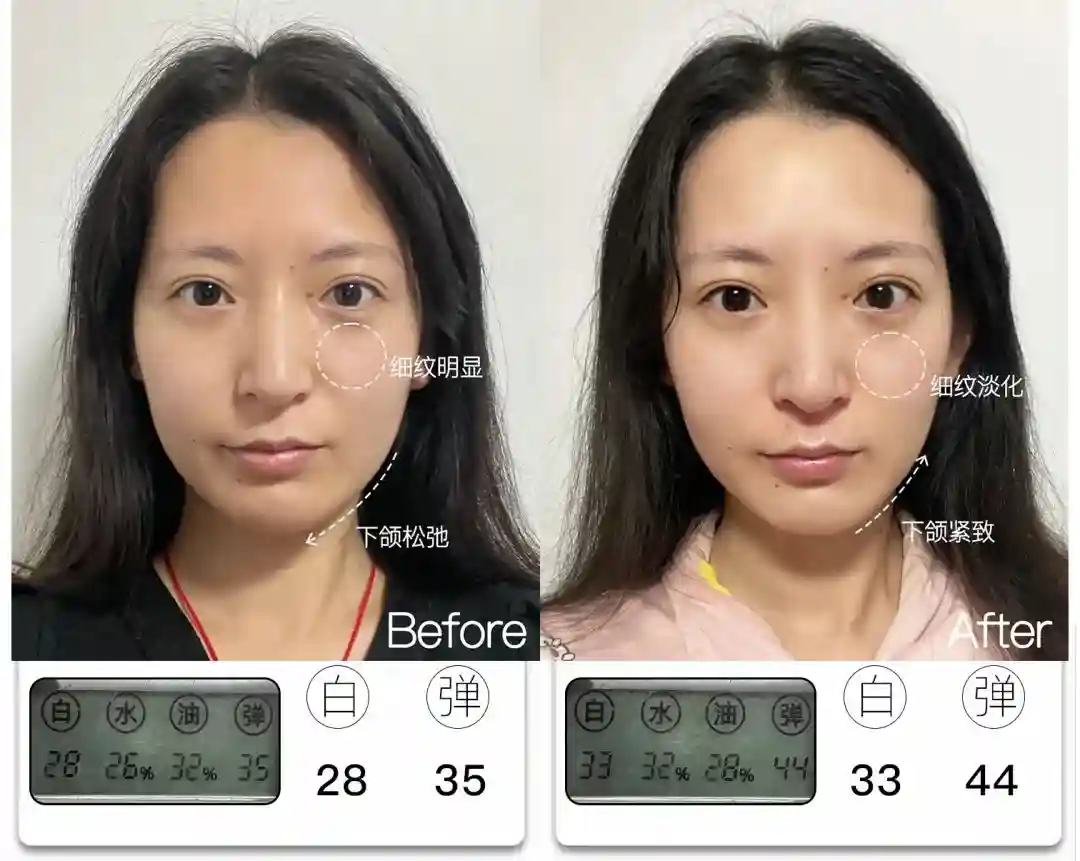 @想去浪啊哟皮肤亮度提升了4分,能看到前后对比图里面,整体肤色肉眼可见地均匀提亮,皮肤从干瘪黯哑变得水润透亮。与此同时,皮肤弹性也提升了9分,饱满弹润,连细纹也被“撑开”变平整,因此淡纹效果也很明显,可以说面部整体年轻化的变化非常大。