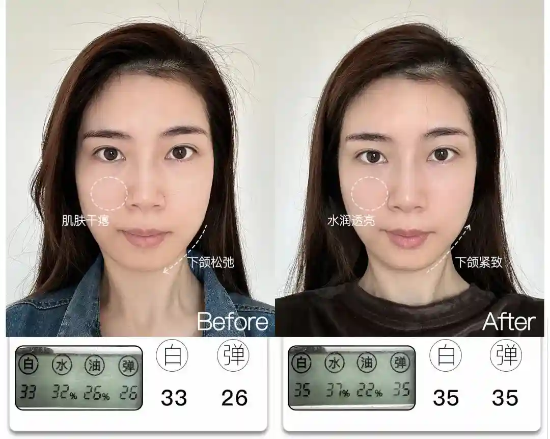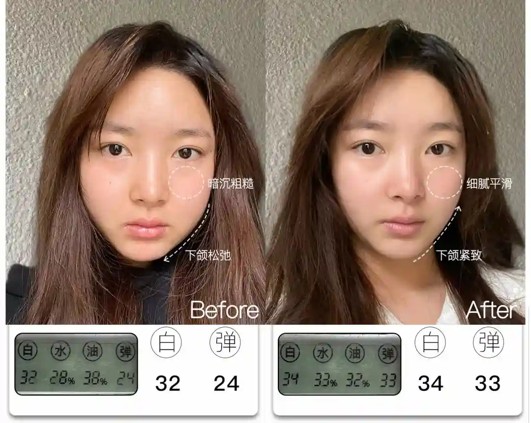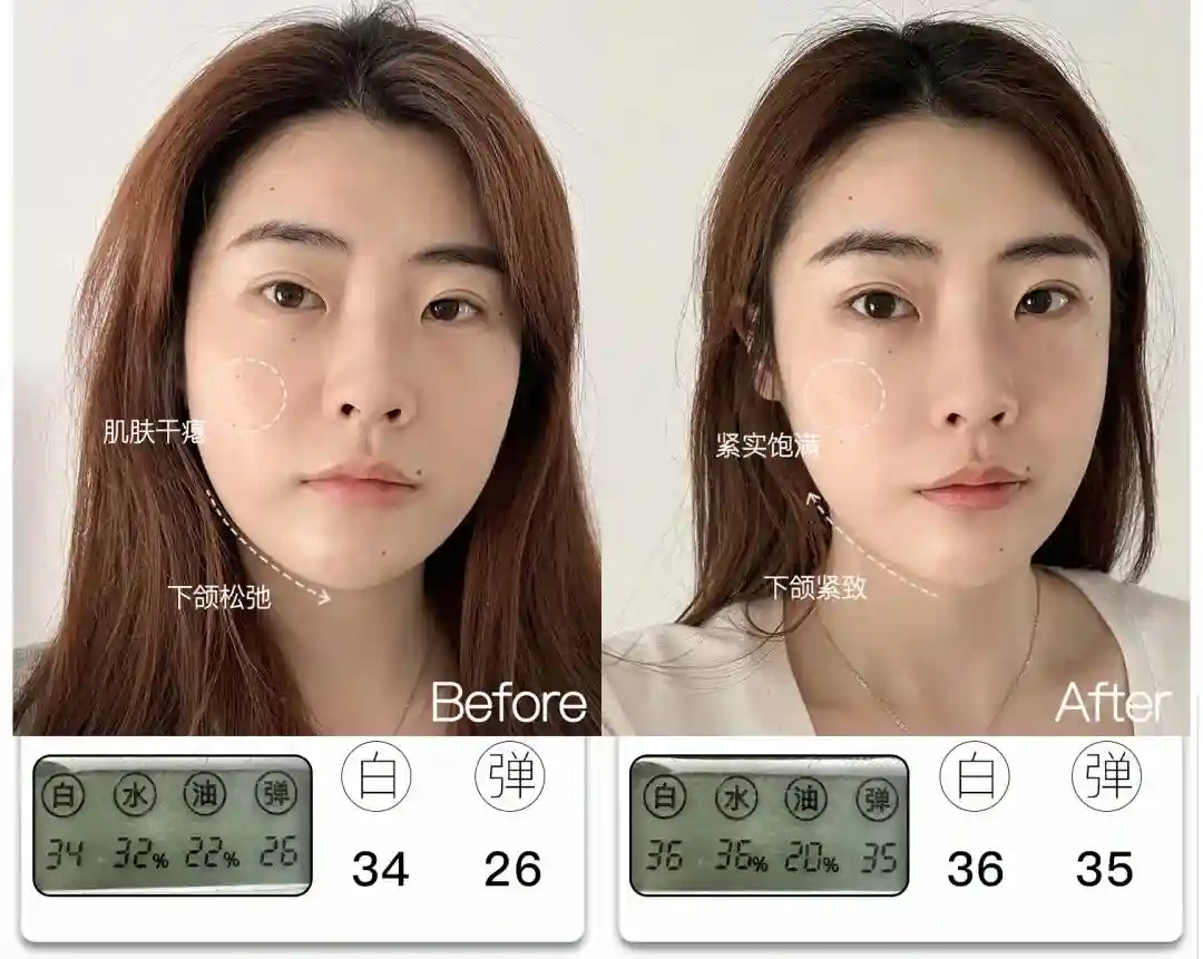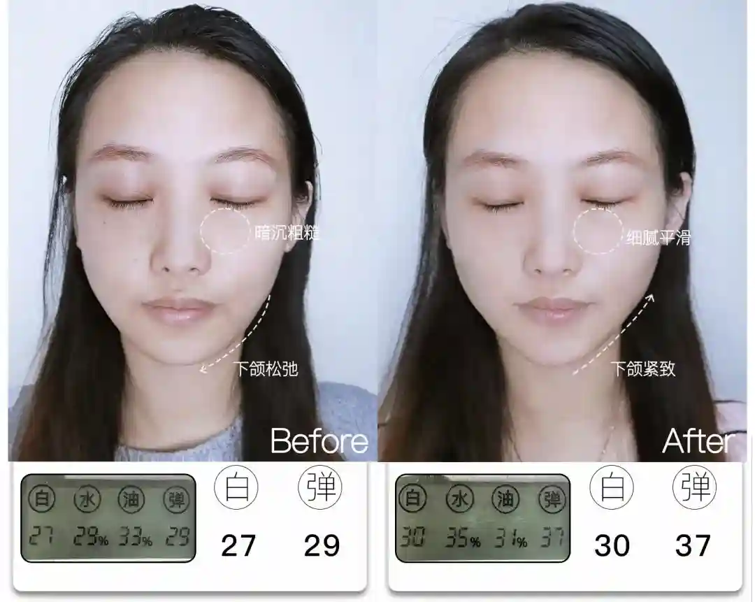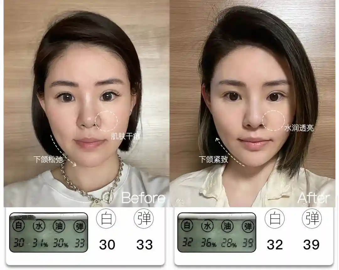 @想去浪啊哟皮肤亮度提升了4分,能看到前后对比图里面,整体肤色肉眼可见地均匀提亮,皮肤从干瘪黯哑变得水润透亮。与此同时,皮肤弹性也提升了9分,饱满弹润,连细纹也被“撑开”变平整,因此淡纹效果也很明显,可以说面部整体年轻化的变化非常大。