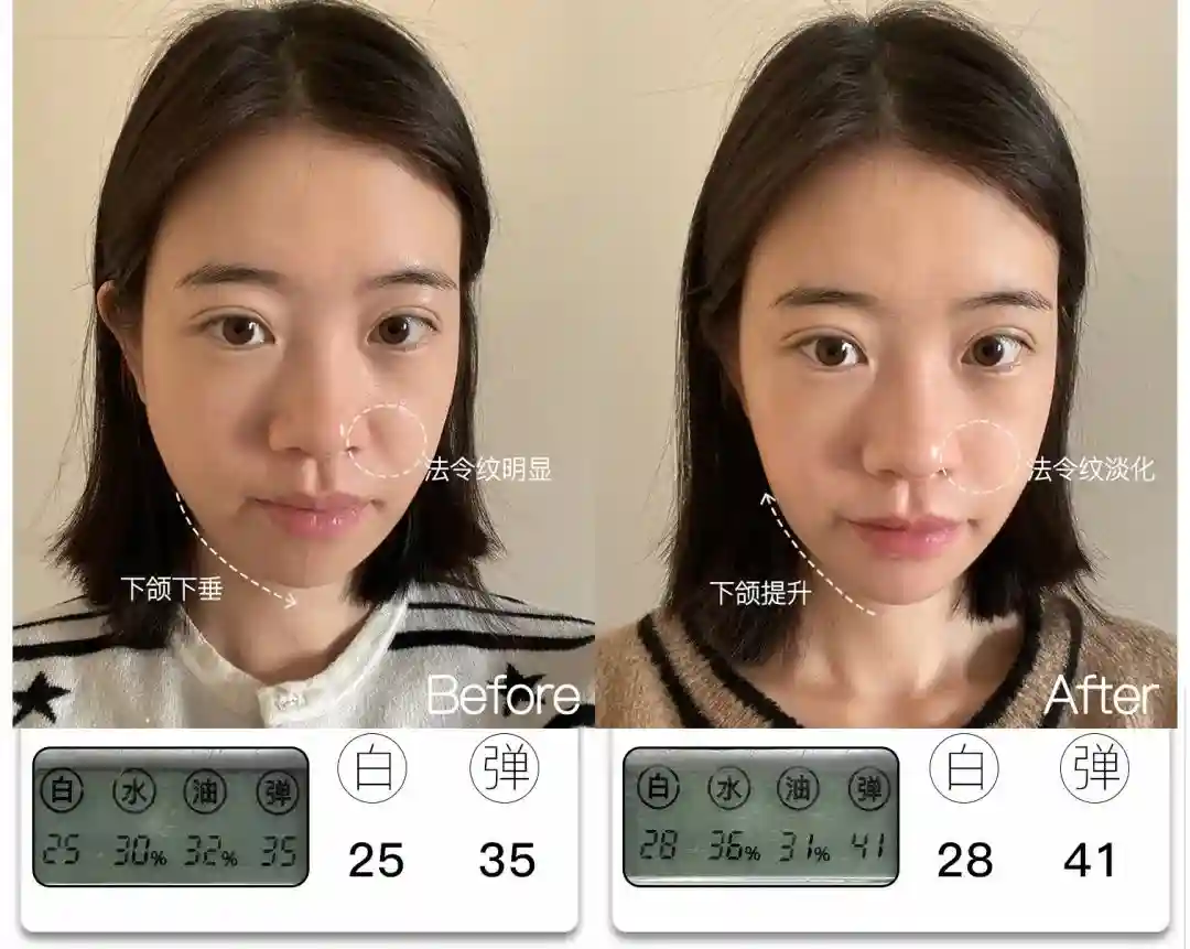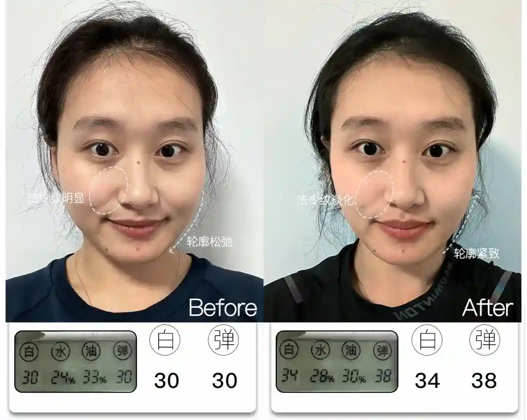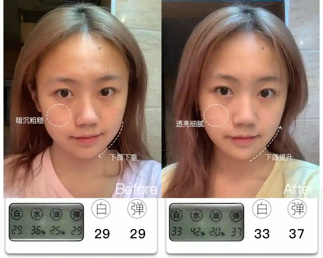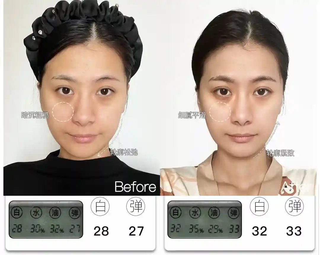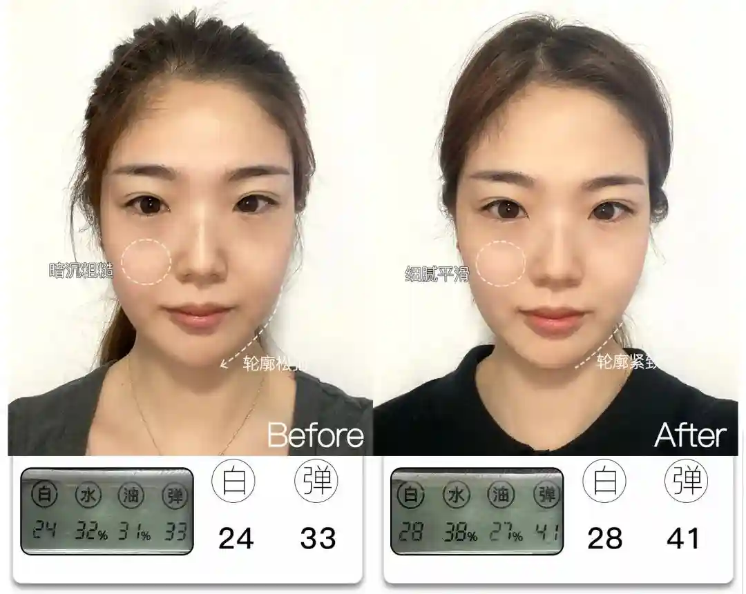 @想去浪啊哟皮肤亮度提升了4分,能看到前后对比图里面,整体肤色肉眼可见地均匀提亮,皮肤从干瘪黯哑变得水润透亮。与此同时,皮肤弹性也提升了9分,饱满弹润,连细纹也被“撑开”变平整,因此淡纹效果也很明显,可以说面部整体年轻化的变化非常大。