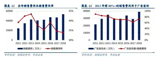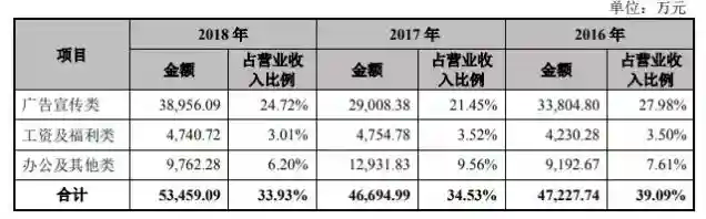丸美招股书显示,其广告宣传花费一直处于高位,2016~2018年分别是:3.38亿元、2.9亿元和3.9亿元,占公司销售费用的比例分别为71.58%、62.12%和72.87%,占公司营收比例为27.98%、21.54%、24.72%。