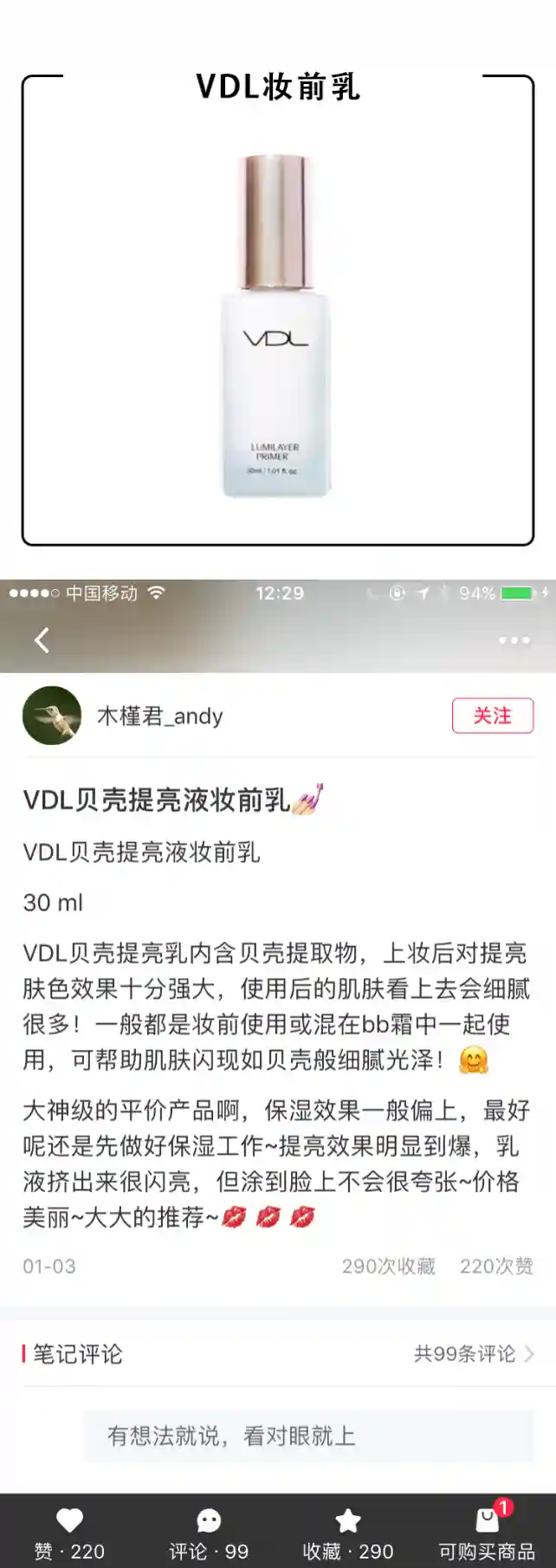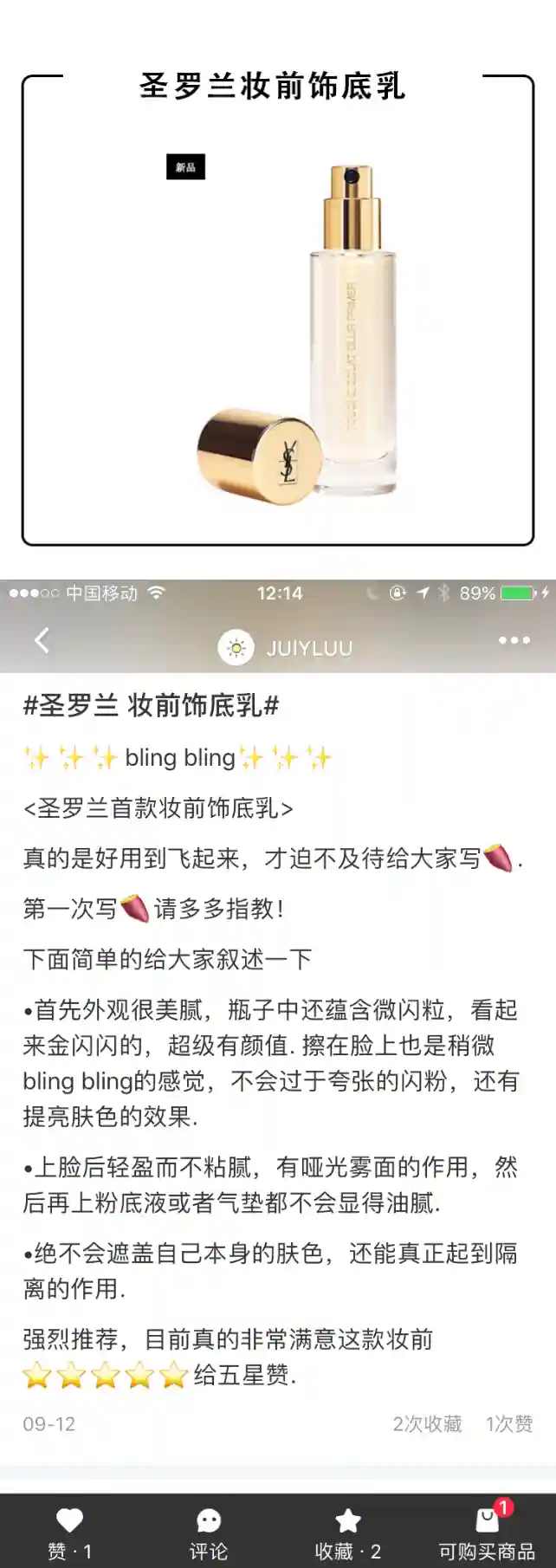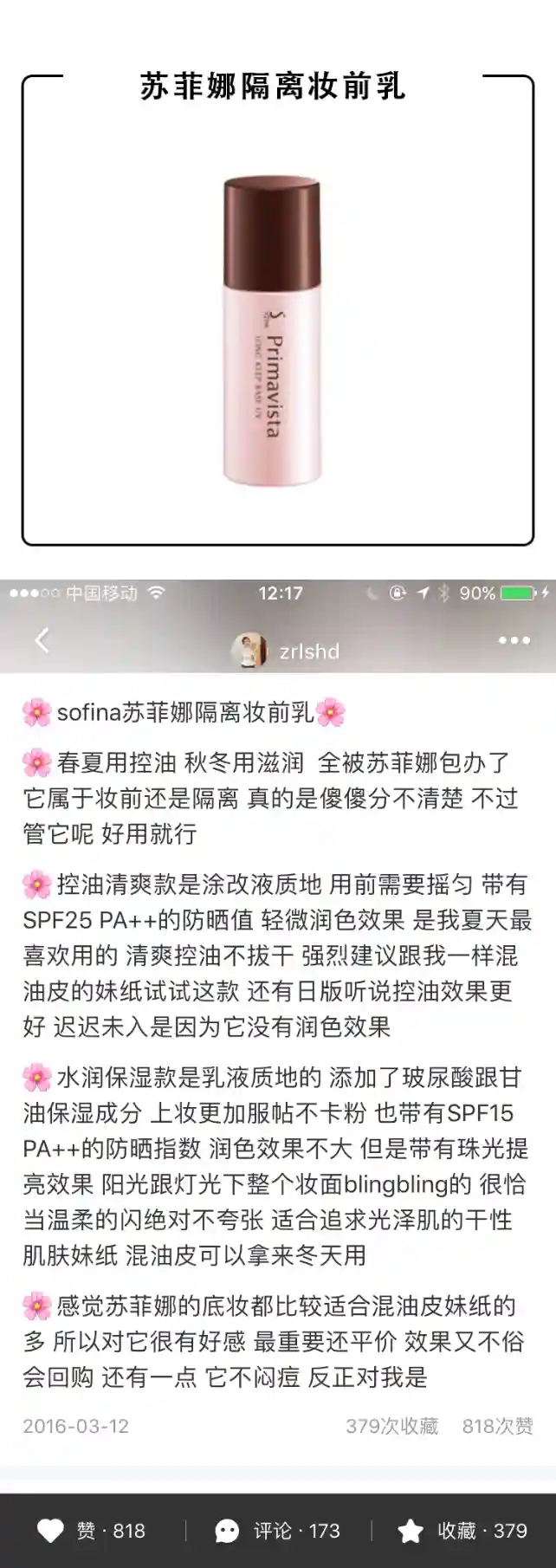 这只妆前里面加入了相当分量的闪粉,几乎和Becca的高光液有的拼!滋润度非常的,.乳霜质地,里面带有明显的闪粉,涂开后脸部非常明显的发光,不过别忘了它是妆前产品,在它之后再上底妆,就会觉得刚刚好,妆前的光泽会隐隐的从肌肤里透出来,给人一种犹抱琵笆半遮面的感觉,超级好看自然。