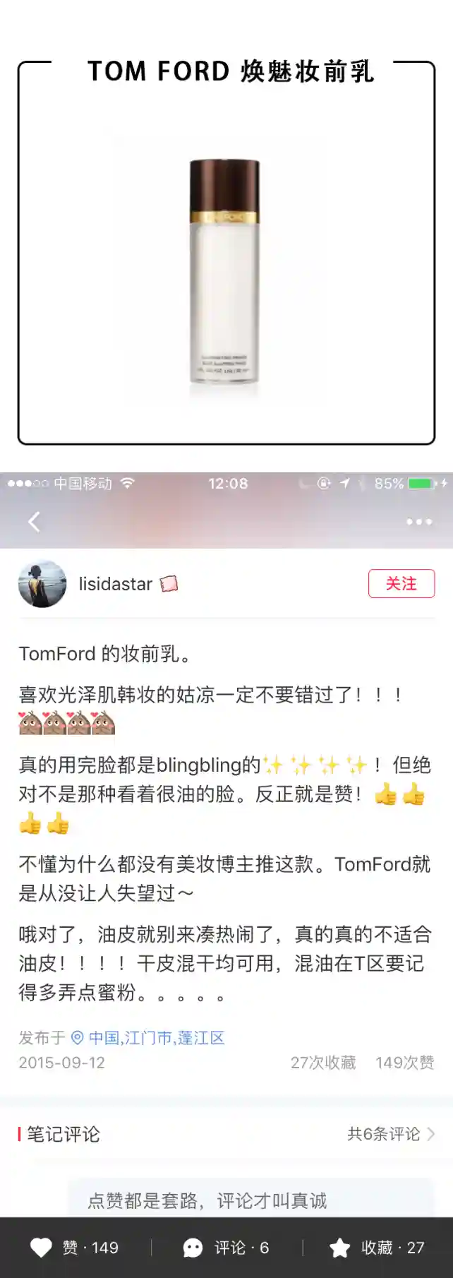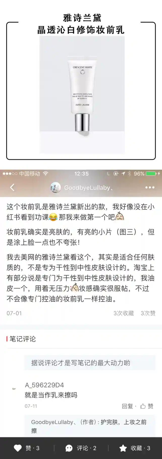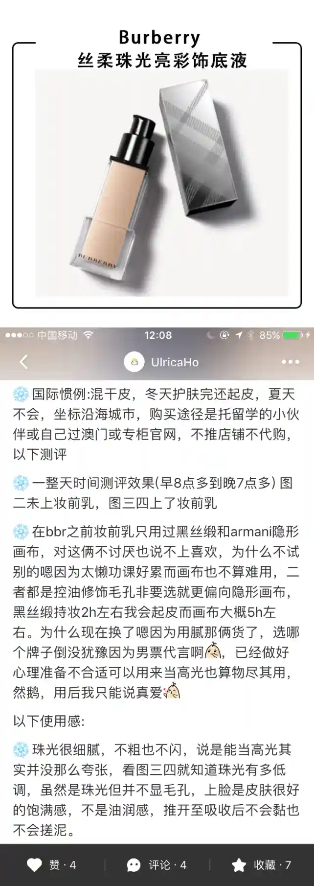 这只妆前里面加入了相当分量的闪粉,几乎和Becca的高光液有的拼!滋润度非常的,.乳霜质地,里面带有明显的闪粉,涂开后脸部非常明显的发光,不过别忘了它是妆前产品,在它之后再上底妆,就会觉得刚刚好,妆前的光泽会隐隐的从肌肤里透出来,给人一种犹抱琵笆半遮面的感觉,超级好看自然。