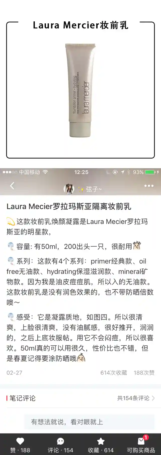 LauraMercier这款妆前乳大名鼎鼎,是非常经典的一款产品,也属于委员心里的万年回购款。它有很多不同的类型,控油、光泽、保湿和普通款。今天介绍的这款是保湿款,非常非常水润,但不会粘腻,触感还是清爽的,而且上脸很快吸收,后续上妆非常服帖,适合干皮妹子们,当然如果你今天要上的粉底是控油款或者特别干,建议各种肤质的女生都要用这种保湿款妆前打个底。